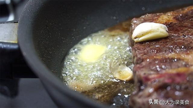 加入压碎的大蒜与奶油,让大蒜与奶油充分与牛排融合后就可以关火。