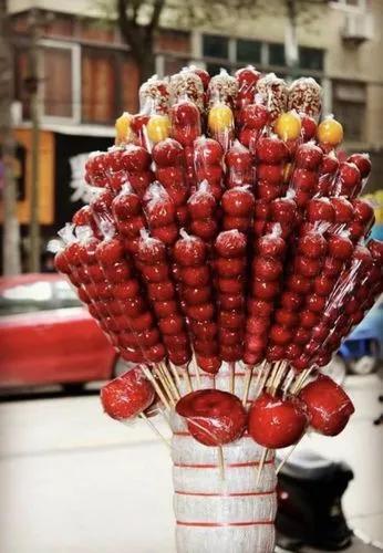 我们现在的糖葫芦也是这种,一小串的,但是老北京传统里,还有种糖葫芦,长有四五尺长,也就是1.5米左右,过年的时候,孩子买上一挂,顶端插一面彩色的小旗,扛在肩头,端的是威风凛凛。