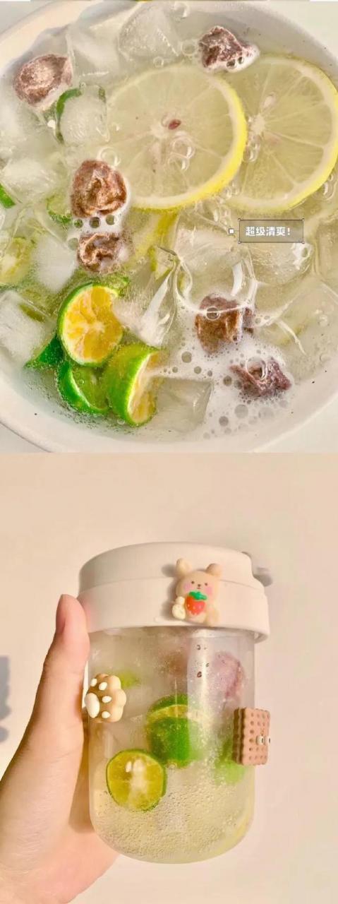 - 做法:柠檬切片,金桔切片,与话梅放在一起,加入适量冰块再倒入雪碧,放进杯中密封盖好上下左右摇晃一下,然后放进冰箱冷藏2小时即可。