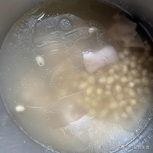 3、倒入砂锅中,大火烧沸直至汤变白,下入提前泡发好的黄豆,转中小火炖至猪蹄和黄豆软烂;