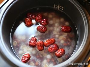 1、将红豆及花生洗净,用水泡 2小时,倒掉水,然后放小锅里,加300毫升水浸盖,中火煮30分钟,关火。保留煮豆汤。莲子用水泡2小时,捞出。把莲芯去掉。红枣洗净,去核。葡萄干洗净。
