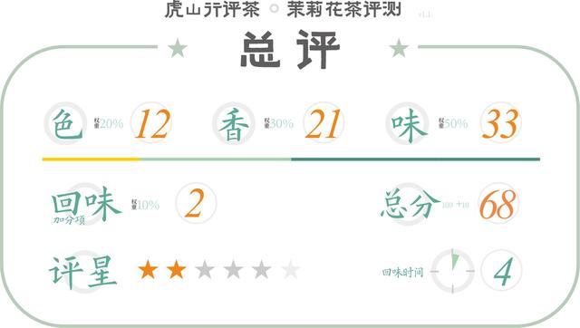 总体看这款茉莉花茶表现比较一般化,香气浓郁程度中等,与茶坯结合有所欠缺,且苦涩感比较明显,尤其是涩感留存时间长,显示此茶的绿茶茶基用料较差,