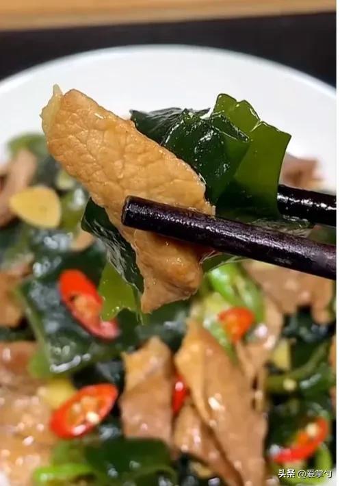 食材:裙带菜,瘦肉、青红小辣椒、葱姜蒜