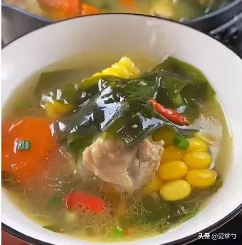 食材:排骨、裙带菜、玉米、胡萝卜、葱花枸杞少量(可不放)