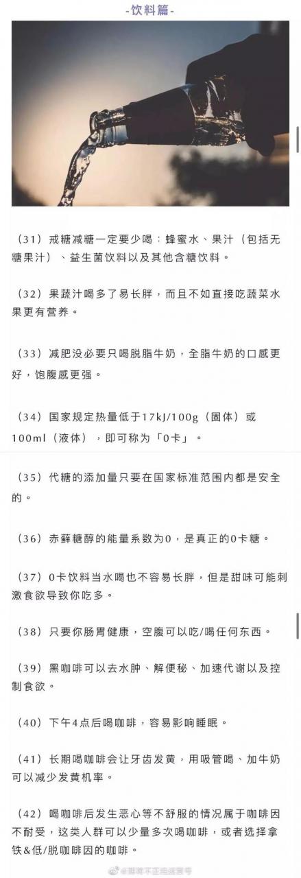 黑咖啡加速代谢哦还可以去水肿,家中必备!牛奶全脂低脂都可以哦,0卡低糖饮料可以解解馋。其他饮料直接拒绝!