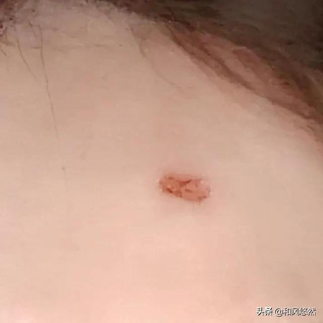 第六天,稍微发痒,不小心挠了一下,揭掉半个硬痂,没有管它,想让它顺其自然的掉。