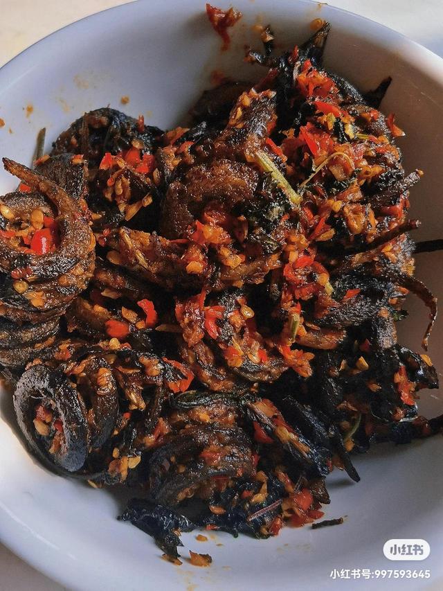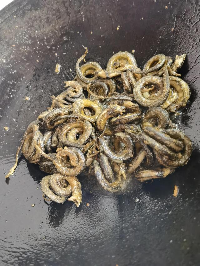 3、洗干净的锅,热锅热油倒入鳝鱼,加盐爆至卷曲,我喜欢鳝鱼干一点有嚼劲,所以久爆一下。