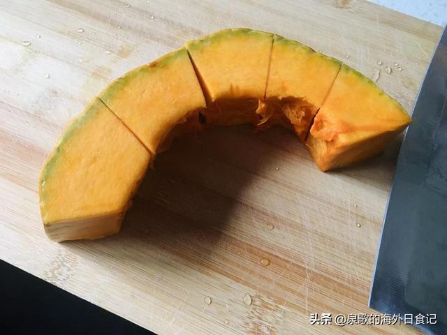超市里经常有切好的横截面的老南瓜,按重量每个2-3元不等。买一个回来,挖去籽,清洗干净,就可以了。如果国外买不到老南瓜,可以用奶油南瓜butternut squash代替。不建议用贝贝南瓜或是日本南瓜,太粉太干,做出来的南瓜粥水分太少,不温润。
