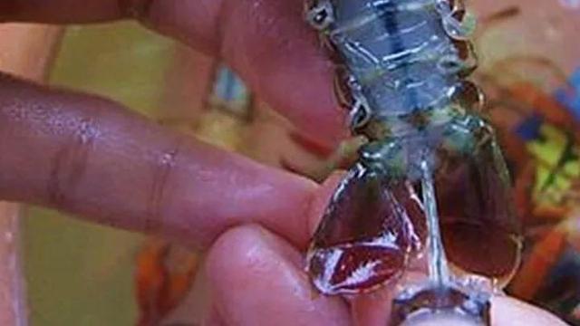 2、刷洗干净的小龙虾剔出虾线,捏住龙虾尾巴中间的那个位置拽出虾线,剪去腮壳,把腮壳里面黑色的东西剔除就好了。